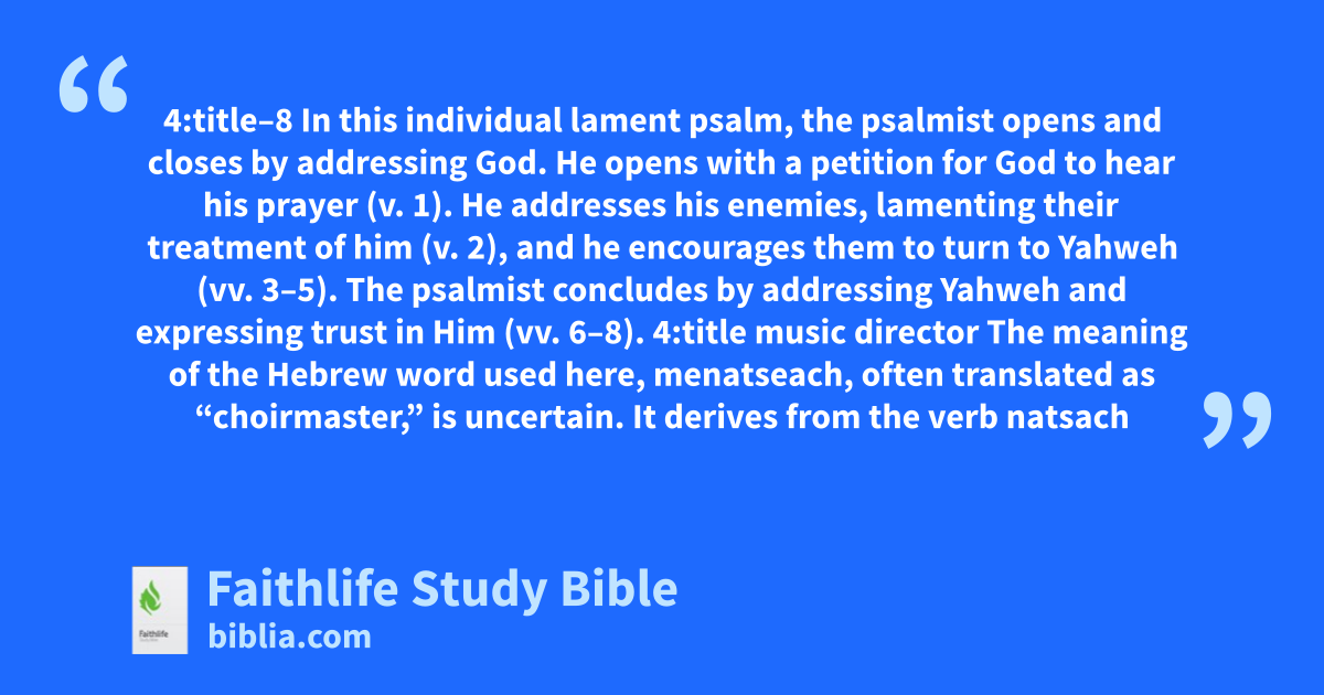 4:title–8 In this individual lament psalm, the psalmist opens and closes by addressing God. He opens with a petition for God to hear his prayer (v. 1). He addresses his enemies, lamenting their treatment of him (v. 2), and he encourages them to turn to Yahweh (vv. 3–5). The psalmist concludes by addressing Yahweh and expressing trust in Him (vv. 6–8). |