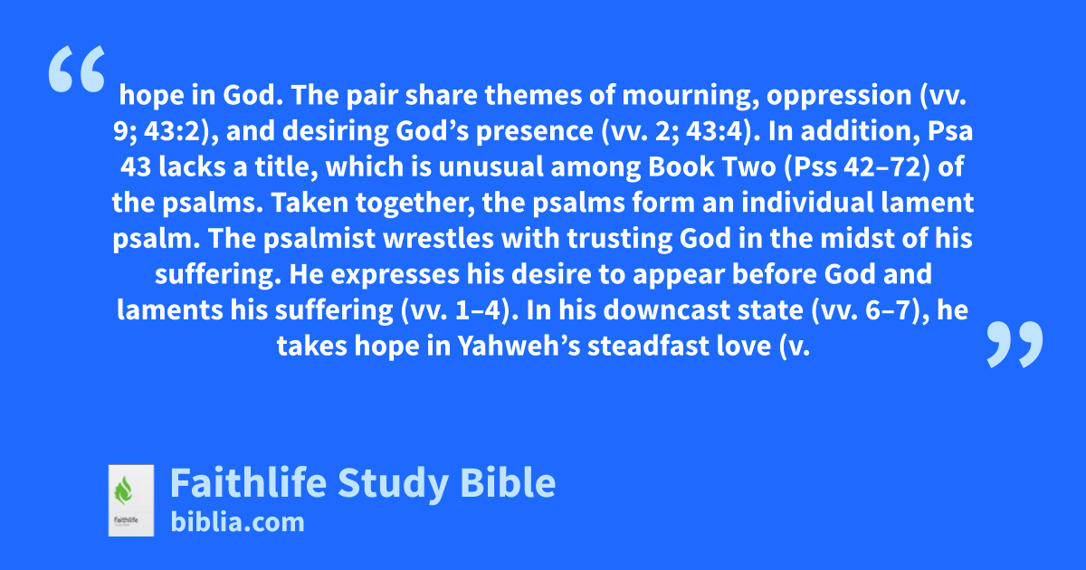 42:title–43:5 Psalm 42 is the first psalm in Book Two (Pss 42–72) of the psalms (see note on 1:1–6). Psalm 42 and 43 were probably originally one psalm. They include an identical refrain (vv. 5, 11; 43:5), in which the psalmist encourages himself to hope in God. The pair share themes of mourning, oppression (vv. 9; 43:2), and desiring God’s presence (vv. 2; 43:4). In addition, Psa 43 lacks a title, which is unusual among Book Two (Pss 42–72) of the psalms. Taken together, the psalms form an individual lament psalm. The psalmist wrestles with trusting God in the midst of his suffering. He expresses his desire to appear before God and laments his suffering (vv. 1–4). In his downcast state (vv. 6–7), he takes hope in Yahweh’s steadfast love (v. 8) and then asks God not to forget him (vv. 9–10). Looking to God for vindication (43:1–2), the psalmist imagines his joy at going before God at the temple (43:3–4). |