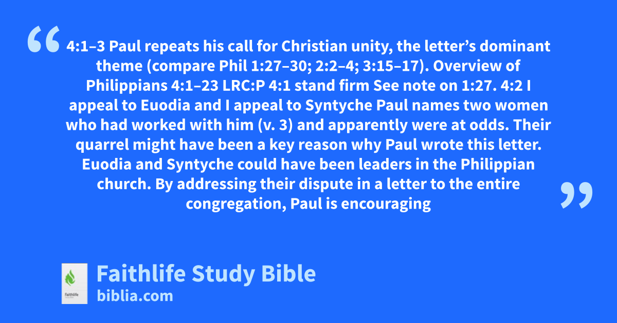 4:1–3 Paul repeats his call for Christian unity, the letter’s dominant theme (compare Phil 1:27–30; 2:2–4; 3:15–17). |