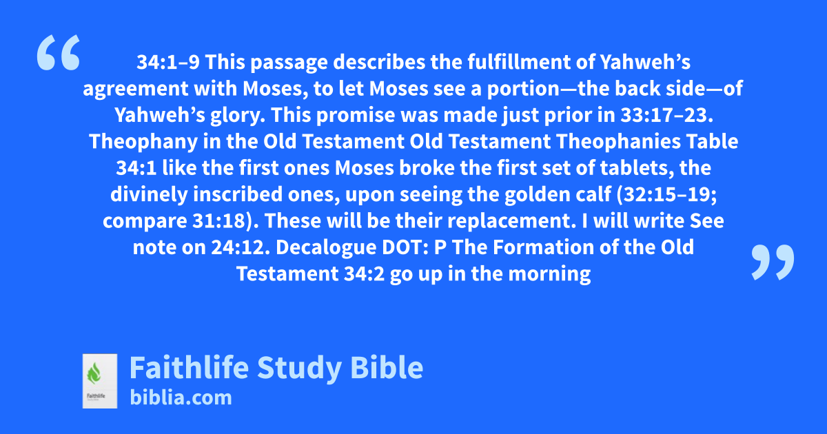 34:1–9 This passage describes the fulfillment of Yahweh’s agreement with Moses, to let Moses see a portion—the back side—of Yahweh’s glory. This promise was made just prior in 33:17–23. |