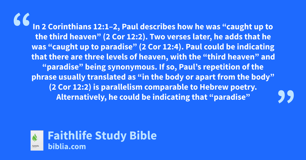 In 2 Corinthians 12:1–2, Paul describes how he was “caught up to the third heaven” (2 Cor 12:2). Two verses later, he adds that he was “caught up to paradise” (2 Cor 12:4). Paul could be indicating that there are three levels of heaven, with the “third heaven” and “paradise” being synonymous. If so, Paul’s repetition of the phrase usually translated as “in the body or apart from the body” (2 Cor 12:2) is parallelism comparable to Hebrew poetry. Alternatively, he could be indicating that “paradise” is higher than the “third heaven.” Paul could be moving through the heavens—into the third heaven in 2 Cor 12:3 and into a higher heaven in 2 Cor 12:4.