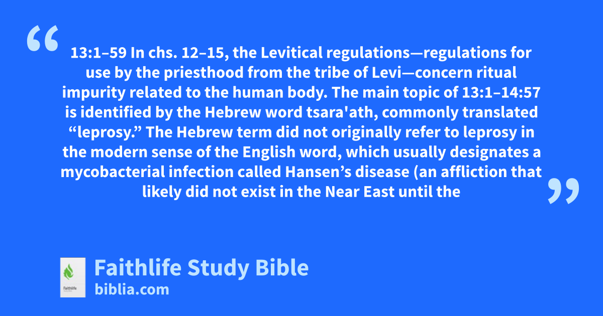 13:1–59 In chs. 12–15, the Levitical regulations—regulations for use by the priesthood from the tribe of Levi—concern ritual impurity related to the human body. The main topic of 13:1–14:57 is identified by the Hebrew word tsara'ath, commonly translated “leprosy.” The Hebrew word tsara'ath is a general term covering a variety of infections that produce visible sores on the skin. From the symptoms described in vv. 1–44, tsara'ath likely includes the following skin diseases known to modern medicine: psoriasis, eczema, dermatitis, favus, scabies, vitiligo, and perhaps skin cancer. The use of tsara'ath for surface infections in textiles and building materials (vv. 47–59; 14:34–53) suggests an even broader range for the word. When tsara'ath applies to a person, a visible skin disease or infection of some kind is meant. When the term applies to inanimate objects, tsara'ath probably designates some kind of mold or mildew that can affect cloth and plaster. Leviticus 13 explains how the priests should go about diagnosing an unclean skin disease. The basic process is the same regardless of the apparent cause of the infection (whether a burn, a boil, or other lesion). The affected person must appear before the priest for examination. In cases where the unclean nature of the infection is not immediately apparent, the priest would quarantine the person for seven days and inspect the infection again. To be declared clean, the marks would have to not spread and to have visibly healed over the course of 14 days of quarantine. If the condition had worsened on reinspection, then the person was pronounced unclean. The specific criteria used to diagnose the condition vary, but they generally include the color of the skin in the diseased area, the color of the hair in the diseased skin, and the size of the infected area.