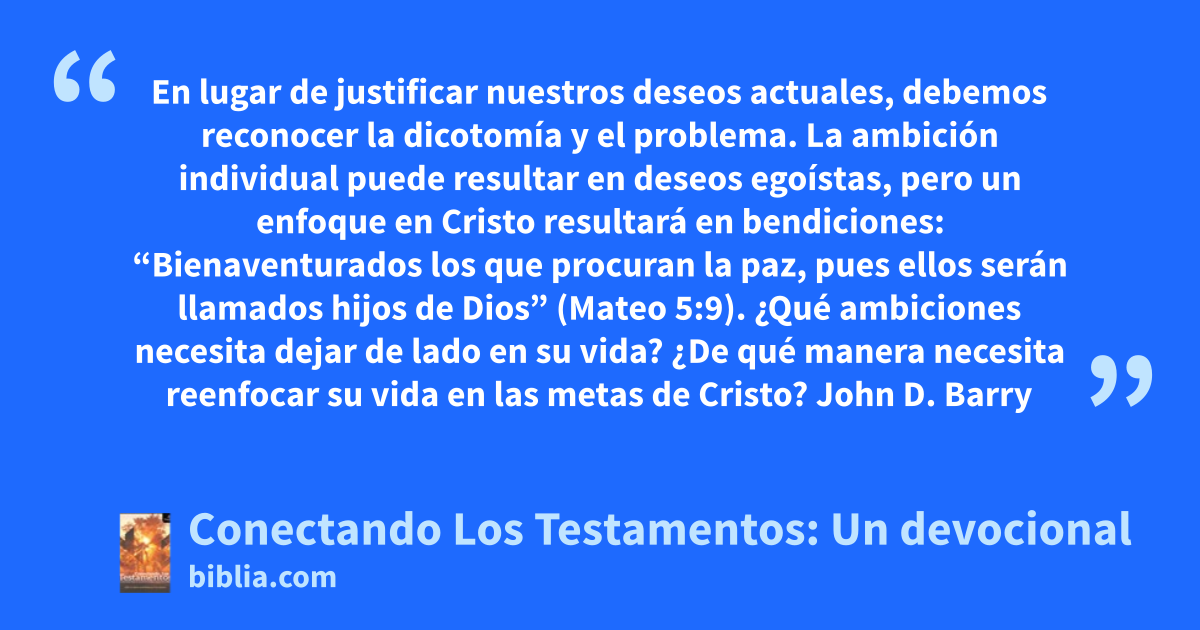 En lugar de justificar nuestros deseos actuales, debemos reconocer la dicotomía y el problema. La ambición individual puede resultar en deseos egoístas, pero un enfoque en Cristo resultará en bendiciones: “Bienaventurados los que procuran la paz, pues ellos serán llamados hijos de Dios” (Mateo 5:9). ¿Qué ambiciones necesita dejar de lado en su vida? ¿De qué manera necesita reenfocar su vida en las metas de Cristo? John D. Barry