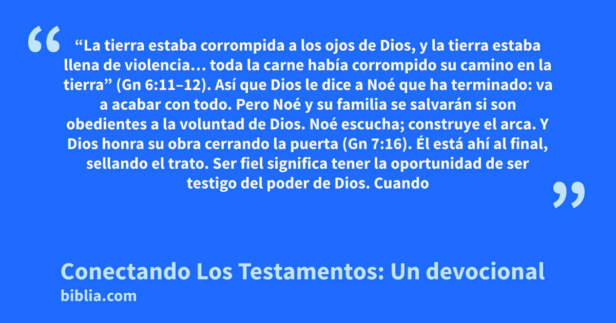 “La tierra estaba corrompida a los ojos de Dios, y la tierra estaba llena de violencia… toda la carne había corrompido su camino en la tierra” (Gn 6:11–12). Así que Dios le dice a Noé que ha terminado: va a acabar con todo. Pero Noé y su familia se salvarán si son obedientes a la voluntad de Dios. Noé escucha; construye el arca. Y Dios honra su obra cerrando la puerta (Gn 7:16). Él está ahí al final, sellando el trato. Ser fiel significa tener la oportunidad de ser testigo del poder de Dios. Cuando