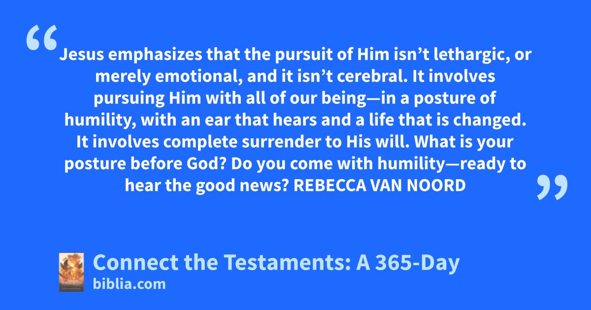 Jesus emphasizes that the pursuit of Him isn’t lethargic, or merely emotional, and it isn’t cerebral. It involves pursuing Him with all of our being—in a posture of humility, with an ear that hears and a life that is changed. It involves complete surrender to His will. What is your posture before God? Do you come with humility—ready to hear the good news? REBECCA VAN NOORD