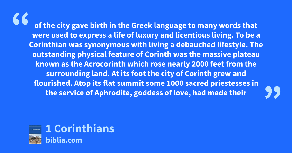 of the city gave birth in the Greek language to many words that were used to express a life of luxury and licentious living. To be a Corinthian was synonymous with living a debauched lifestyle. The outstanding physical feature of Corinth was the massive plateau known as the Acrocorinth which rose nearly 2000 feet from the surrounding land. At its foot the city of Corinth grew and flourished. Atop its flat summit some 1000 sacred priestesses in the service of Aphrodite, goddess of love, had made their