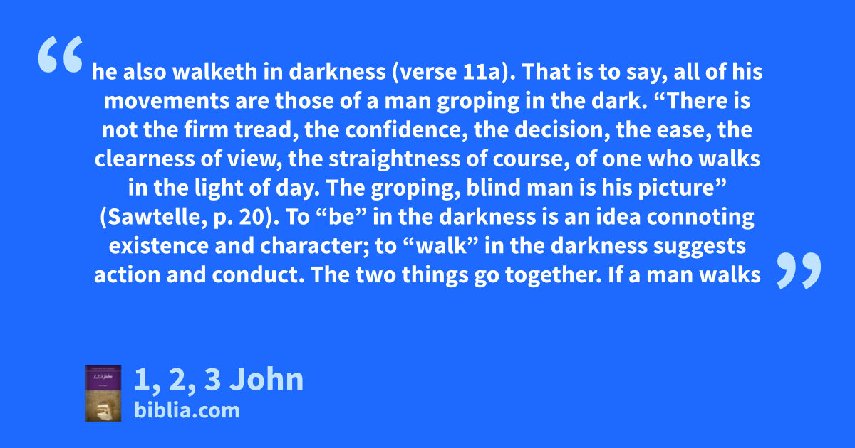 he also walketh in darkness (verse 11a). That is to say, all of his movements are those of a man groping in the dark. “There is not the firm tread, the confidence, the decision, the ease, the clearness of view, the straightness of course, of one who walks in the light of day. The groping, blind man is his picture” (Sawtelle, p. 20). To “be” in the darkness is an idea connoting existence and character; to “walk” in the darkness suggests action and conduct. The two things go together. If a man walks