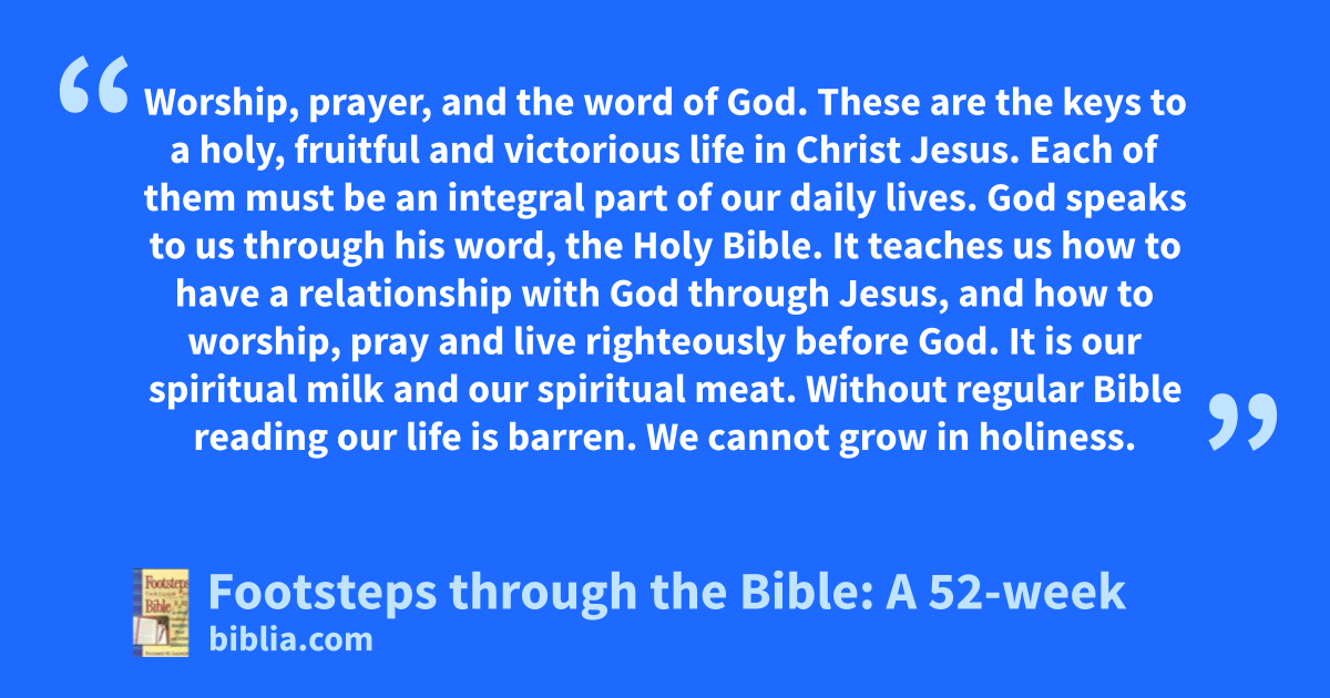 Worship, prayer, and the word of God. These are the keys to a holy, fruitful and victorious life in Christ Jesus. Each of them must be an integral part of our daily lives. God speaks to us through his word, the Holy Bible. It teaches us how to have a relationship with God through Jesus, and how to worship, pray and live righteously before God. It is our spiritual milk and our spiritual meat. Without regular Bible reading our life is barren. We cannot grow in holiness.