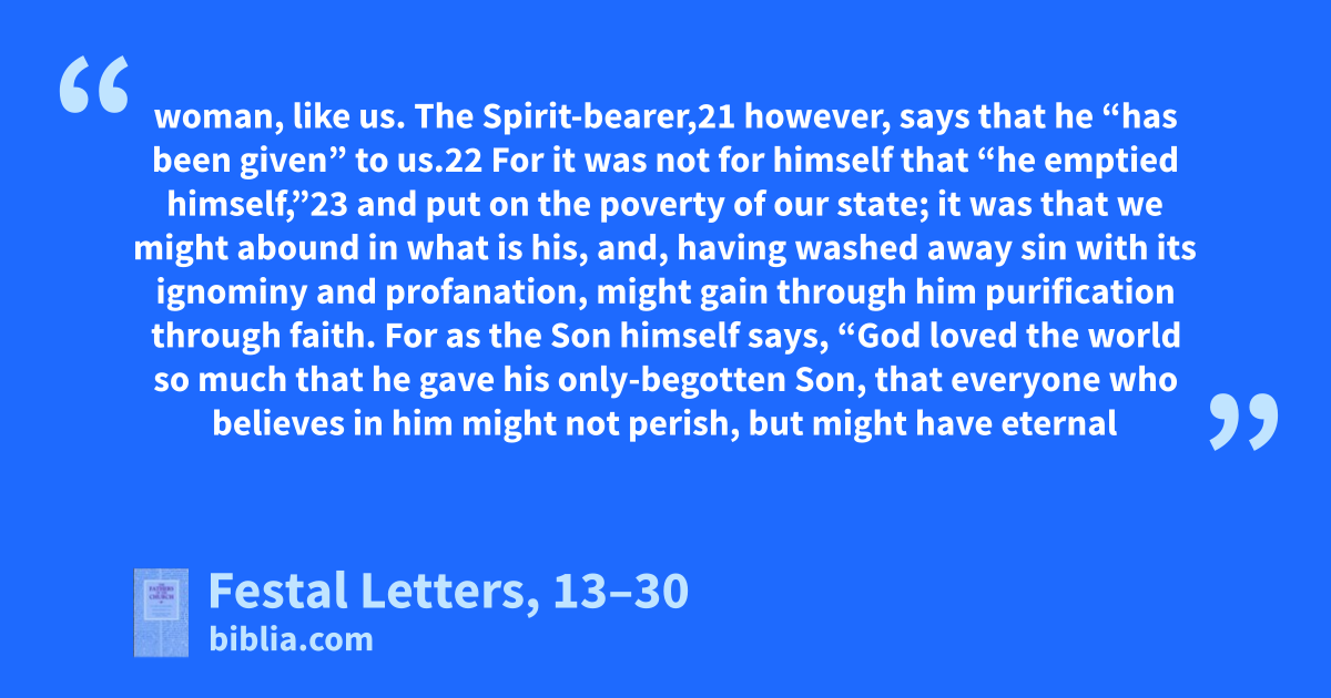 woman, like us. The Spirit-bearer,21 however, says that he “has been given” to us.22 For it was not for himself that “he emptied himself,”23 and put on the poverty of our state; it was that we might abound in what is his, and, having washed away sin with its ignominy and profanation, might gain through him purification through faith. For as the Son himself says, “God loved the world so much that he gave his only-begotten Son, that everyone who believes in him might not perish, but might have eternal