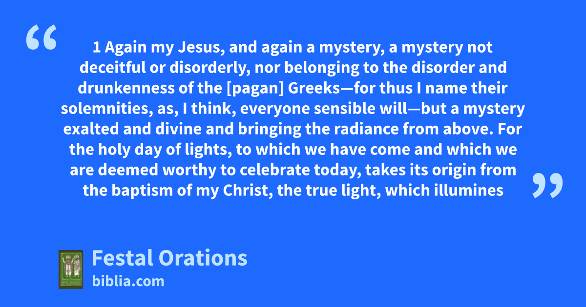 1 Again my Jesus, and again a mystery, a mystery not deceitful or disorderly, nor belonging to the disorder and drunkenness of the [pagan] Greeks—for thus I name their solemnities, as, I think, everyone sensible will—but a mystery exalted and divine and bringing the radiance from above. For the holy day of lights, to which we have come and which we are deemed worthy to celebrate today, takes its origin from the baptism of my Christ, the true light, which illumines