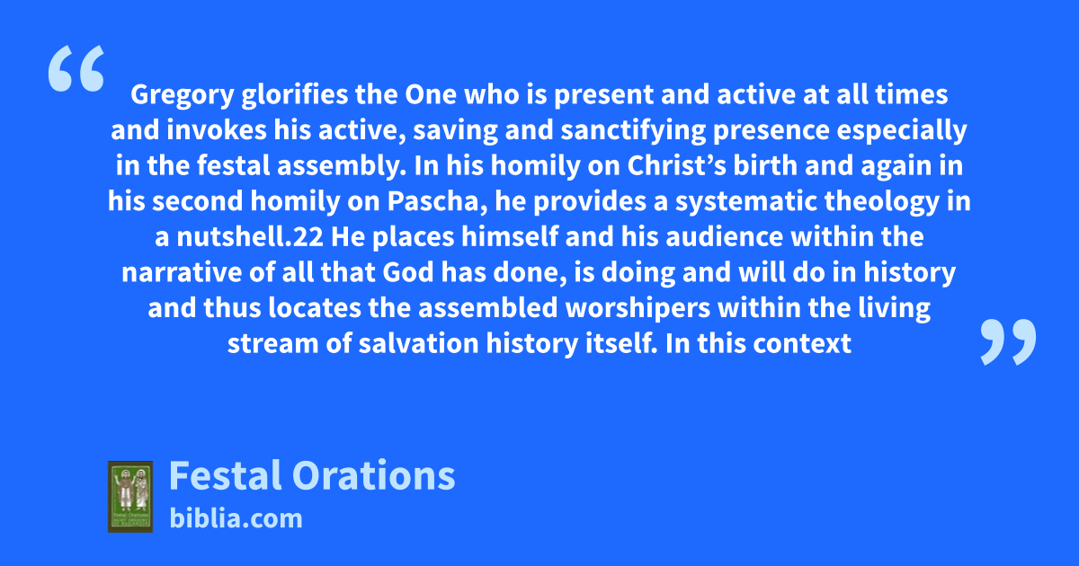 Gregory glorifies the One who is present and active at all times and invokes his active, saving and sanctifying presence especially in the festal assembly. In his homily on Christ’s birth and again in his second homily on Pascha, he provides a systematic theology in a nutshell.22 He places himself and his audience within the narrative of all that God has done, is doing and will do in history and thus locates the assembled worshipers within the living stream of salvation history itself. In this context