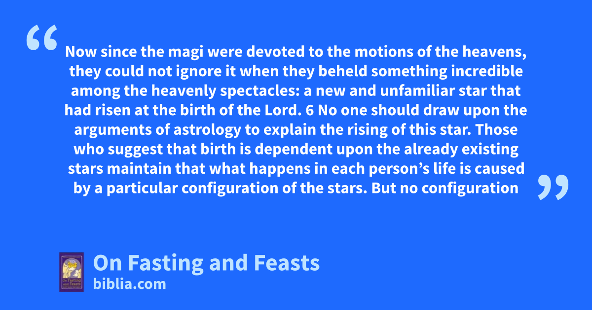 Now since the magi were devoted to the motions of the heavens, they could not ignore it when they beheld something incredible among the heavenly spectacles: a new and unfamiliar star that had risen at the birth of the Lord. 6 No one should draw upon the arguments of astrology to explain the rising of this star. Those who suggest that birth is dependent upon the already existing stars maintain that what happens in each person’s life is caused by a particular configuration of the stars. But no configuration