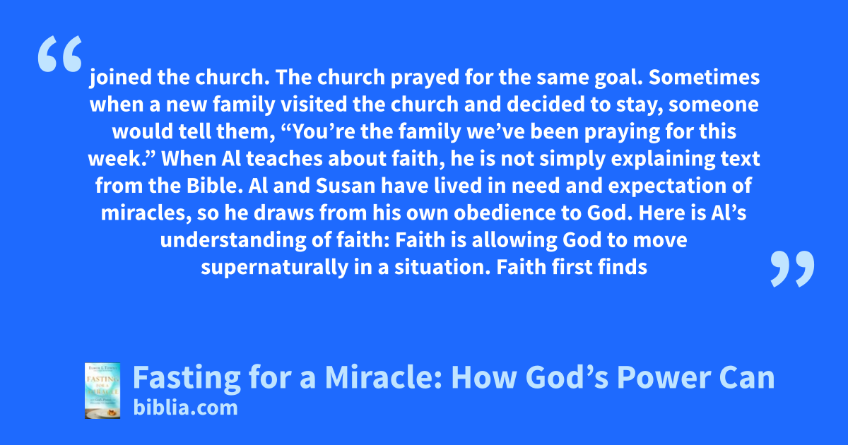 joined the church. The church prayed for the same goal. Sometimes when a new family visited the church and decided to stay, someone would tell them, “You’re the family we’ve been praying for this week.” When Al teaches about faith, he is not simply explaining text from the Bible. Al and Susan have lived in need and expectation of miracles, so he draws from his own obedience to God. Here is Al’s understanding of faith: Faith is allowing God to move supernaturally in a situation. Faith first finds