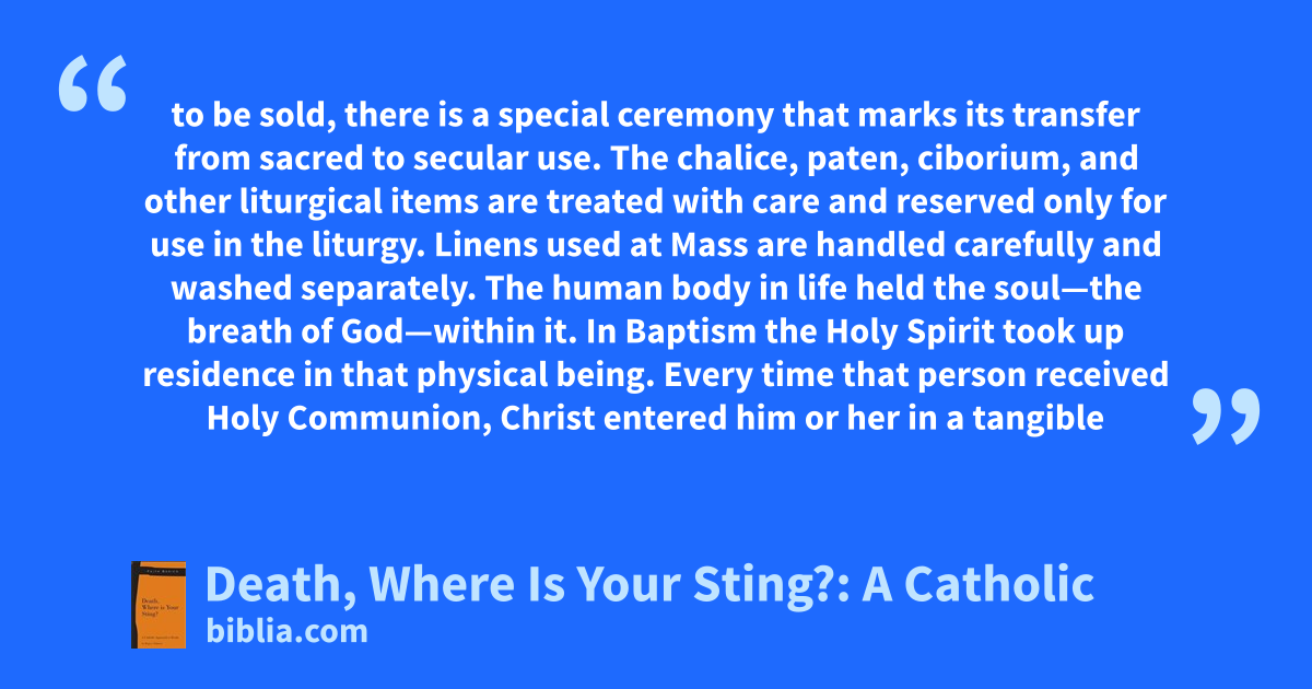 to be sold, there is a special ceremony that marks its transfer from sacred to secular use. The chalice, paten, ciborium, and other liturgical items are treated with care and reserved only for use in the liturgy. Linens used at Mass are handled carefully and washed separately. The human body in life held the soul—the breath of God—within it. In Baptism the Holy Spirit took up residence in that physical being. Every time that person received Holy Communion, Christ entered him or her in a tangible