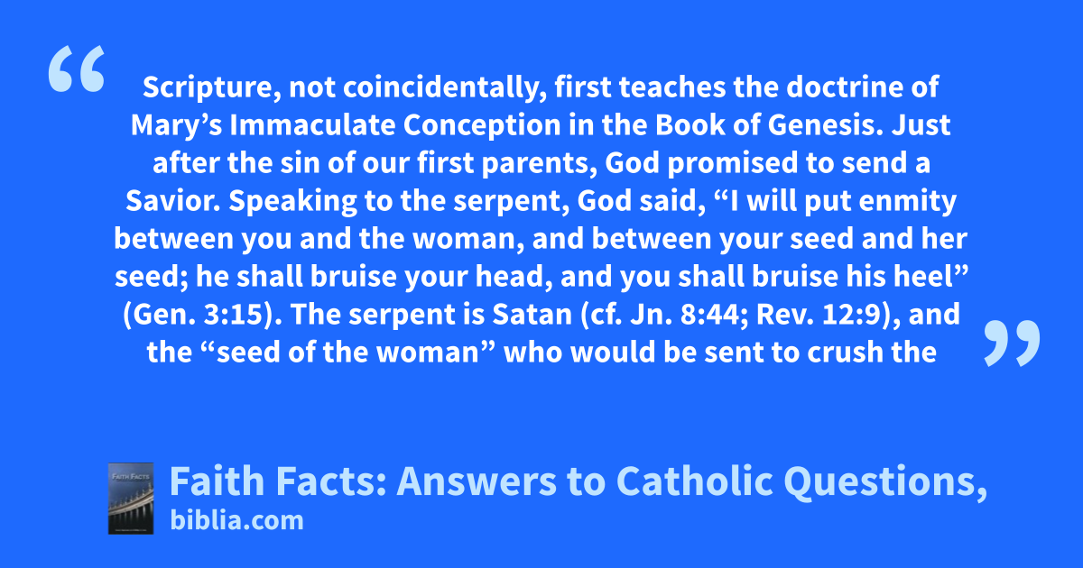 Scripture, not coincidentally, first teaches the doctrine of Mary’s Immaculate Conception in the Book of Genesis. Just after the sin of our first parents, God promised to send a Savior. Speaking to the serpent, God said, “I will put enmity between you and the woman, and between your seed and her seed; he shall bruise your head, and you shall bruise his heel” (Gen. 3:15). The serpent is Satan (cf. Jn. 8:44; Rev. 12:9), and the “seed of the woman” who would be sent to crush the
