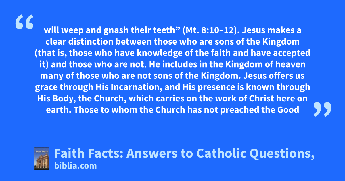 will weep and gnash their teeth” (Mt. 8:10–12). Jesus makes a clear distinction between those who are sons of the Kingdom (that is, those who have knowledge of the faith and have accepted it) and those who are not. He includes in the Kingdom of heaven many of those who are not sons of the Kingdom. Jesus offers us grace through His Incarnation, and His presence is known through His Body, the Church, which carries on the work of Christ here on earth. Those to whom the Church has not preached the Good