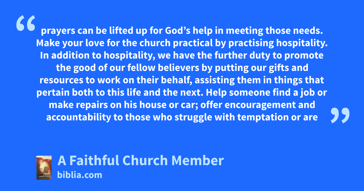prayers can be lifted up for God’s help in meeting those needs. Make your love for the church practical by practising hospitality. In addition to hospitality, we have the further duty to promote the good of our fellow believers by putting our gifts and resources to work on their behalf, assisting them in things that pertain both to this life and the next. Help someone find a job or make repairs on his house or car; offer encouragement and accountability to those who struggle with temptation or are