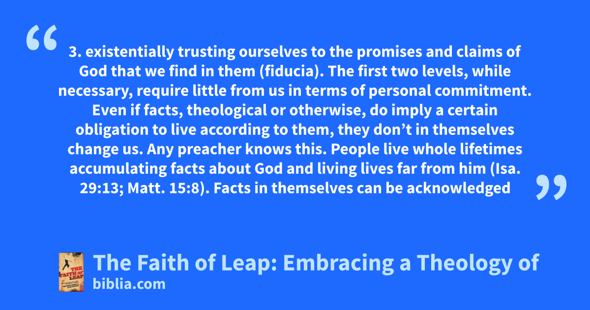 3. existentially trusting ourselves to the promises and claims of God that we find in them (fiducia). The first two levels, while necessary, require little from us in terms of personal commitment. Even if facts, theological or otherwise, do imply a certain obligation to live according to them, they don’t in themselves change us. Any preacher knows this. People live whole lifetimes accumulating facts about God and living lives far from him (Isa. 29:13; Matt. 15:8). Facts in themselves can be acknowledged