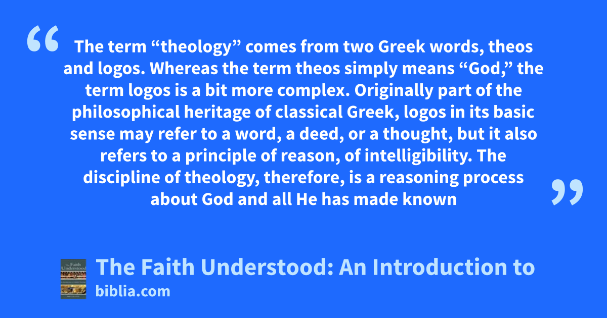The term “theology” comes from two Greek words, theos and logos. Whereas the term theos simply means “God,” the term logos is a bit more complex. Originally part of the philosophical heritage of classical Greek, logos in its basic sense may refer to a word, a deed, or a thought, but it also refers to a principle of reason, of intelligibility. The discipline of theology, therefore, is a reasoning process about God and all He has made known
