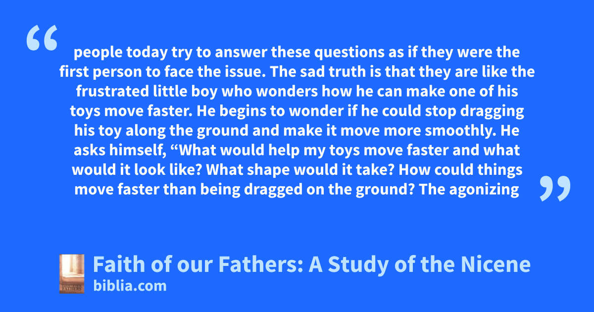 people today try to answer these questions as if they were the first person to face the issue. The sad truth is that they are like the frustrated little boy who wonders how he can make one of his toys move faster. He begins to wonder if he could stop dragging his toy along the ground and make it move more smoothly. He asks himself, “What would help my toys move faster and what would it look like? What shape would it take? How could things move faster than being dragged on the ground? The agonizing