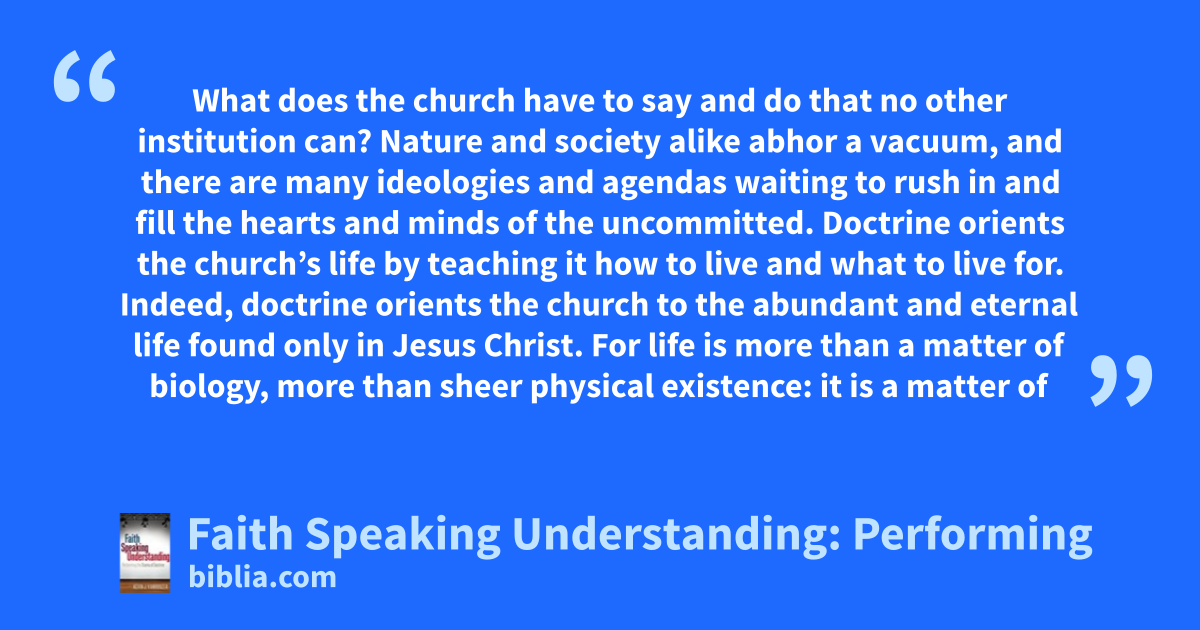 What does the church have to say and do that no other institution can? Nature and society alike abhor a vacuum, and there are many ideologies and agendas waiting to rush in and fill the hearts and minds of the uncommitted. Doctrine orients the church’s life by teaching it how to live and what to live for. Indeed, doctrine orients the church to the abundant and eternal life found only in Jesus Christ. For life is more than a matter of biology, more than sheer physical existence: it is a matter of