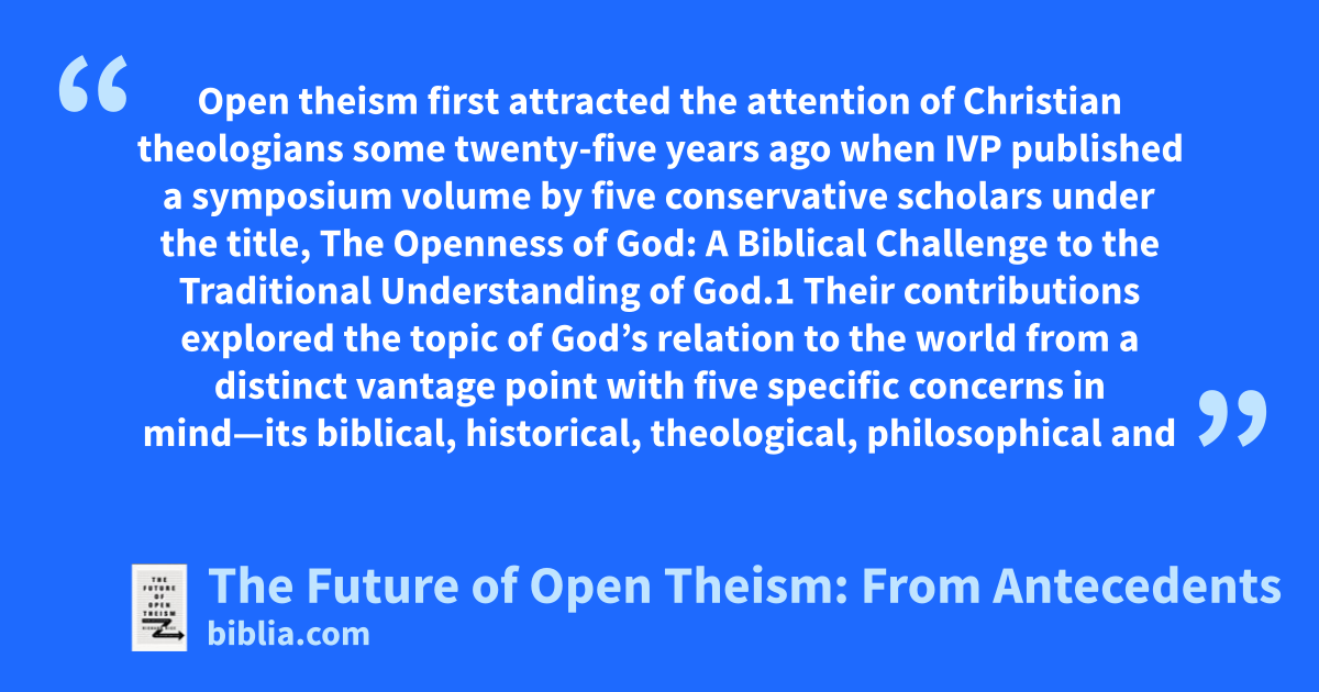 Open theism first attracted the attention of Christian theologians some twenty-five years ago when IVP published a symposium volume by five conservative scholars under the title, The Openness of God: A Biblical Challenge to the Traditional Understanding of God.1 Their contributions explored the topic of God’s relation to the world from a distinct vantage point with five specific concerns in mind—its biblical, historical, theological, philosophical and