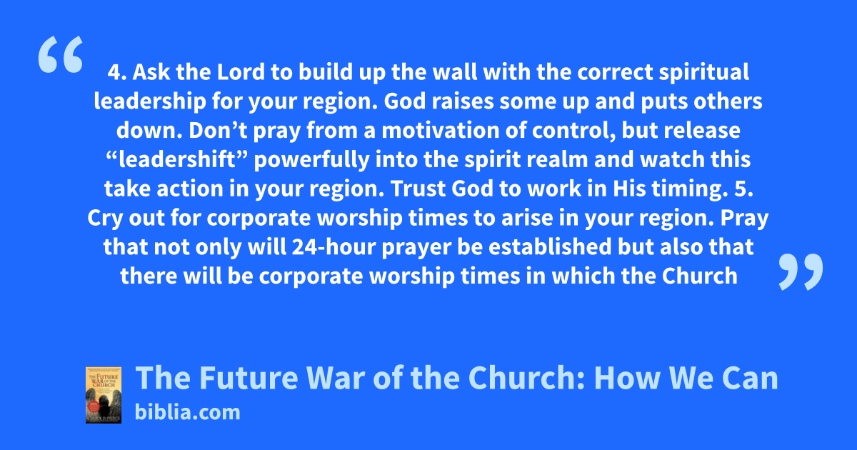 4. Ask the Lord to build up the wall with the correct spiritual leadership for your region. God raises some up and puts others down. Don’t pray from a motivation of control, but release “leadershift” powerfully into the spirit realm and watch this take action in your region. Trust God to work in His timing. 5. Cry out for corporate worship times to arise in your region. Pray that not only will 24-hour prayer be established but also that there will be corporate worship times in which the Church