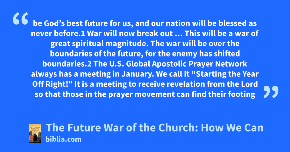 be God’s best future for us, and our nation will be blessed as never before.1 War will now break out … This will be a war of great spiritual magnitude. The war will be over the boundaries of the future, for the enemy has shifted boundaries.2 The U.S. Global Apostolic Prayer Network always has a meeting in January. We call it “Starting the Year Off Right!” It is a meeting to receive revelation from the Lord so that those in the prayer movement can find their footing