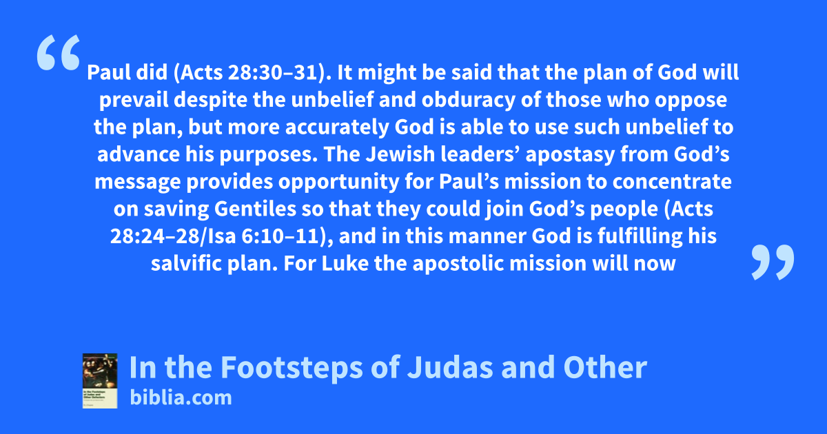 Paul did (Acts 28:30–31). It might be said that the plan of God will prevail despite the unbelief and obduracy of those who oppose the plan, but more accurately God is able to use such unbelief to advance his purposes. The Jewish leaders’ apostasy from God’s message provides opportunity for Paul’s mission to concentrate on saving Gentiles so that they could join God’s people (Acts 28:24–28/Isa 6:10–11), and in this manner God is fulfilling his salvific plan. For Luke the apostolic mission will now
