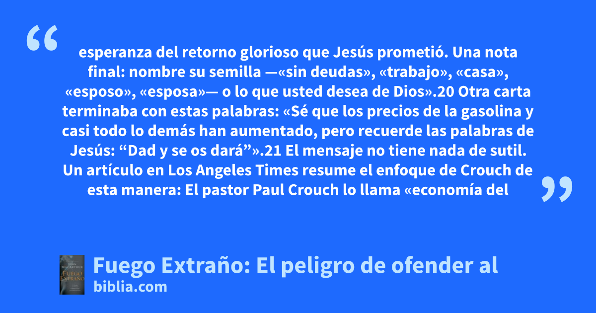 esperanza del retorno glorioso que Jesús prometió. Una nota final: nombre su semilla —«sin deudas», «trabajo», «casa», «esposo», «esposa»— o lo que usted desea de Dios».20 Otra carta terminaba con estas palabras: «Sé que los precios de la gasolina y casi todo lo demás han aumentado, pero recuerde las palabras de Jesús: “Dad y se os dará”».21 El mensaje no tiene nada de sutil. Un artículo en Los Angeles Times resume el enfoque de Crouch de esta manera: El pastor Paul Crouch lo llama «economía del