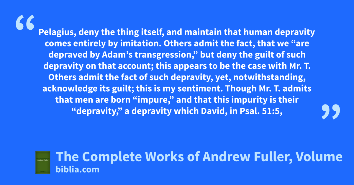 Pelagius, deny the thing itself, and maintain that human depravity comes entirely by imitation. Others admit the fact, that we “are depraved by Adam’s transgression,” but deny the guilt of such depravity on that account; this appears to be the case with Mr. T. Others admit the fact of such depravity, yet, notwithstanding, acknowledge its guilt; this is my sentiment. Though Mr. T. admits that men are born “impure,” and that this impurity is their “depravity,” a depravity which David, in Psal. 51:5,