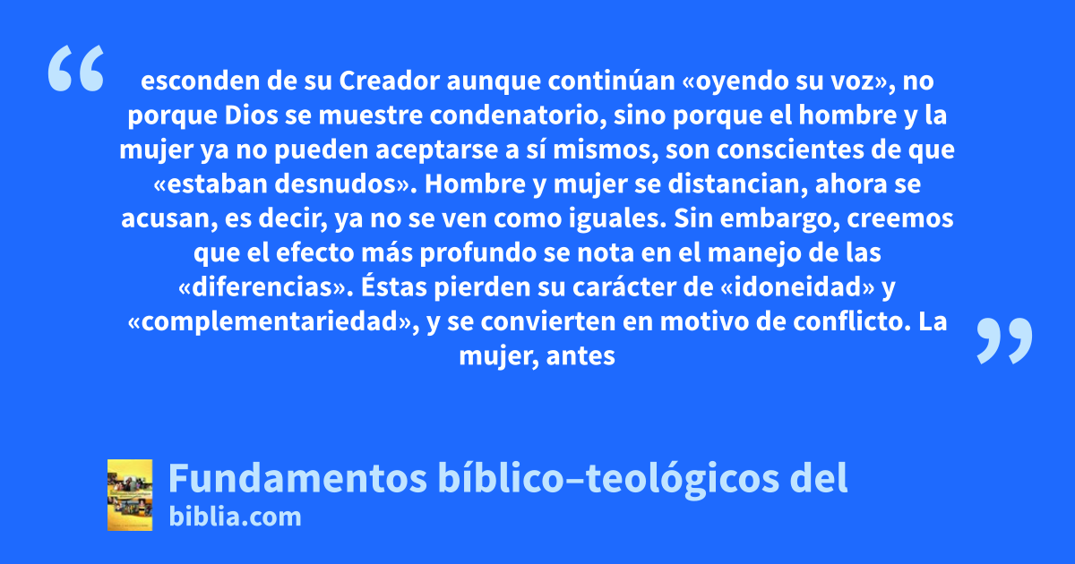 esconden de su Creador aunque continúan «oyendo su voz», no porque Dios se muestre condenatorio, sino porque el hombre y la mujer ya no pueden aceptarse a sí mismos, son conscientes de que «estaban desnudos». Hombre y mujer se distancian, ahora se acusan, es decir, ya no se ven como iguales. Sin embargo, creemos que el efecto más profundo se nota en el manejo de las «diferencias». Éstas pierden su carácter de «idoneidad» y «complementariedad», y se convierten en motivo de conflicto. La mujer, antes