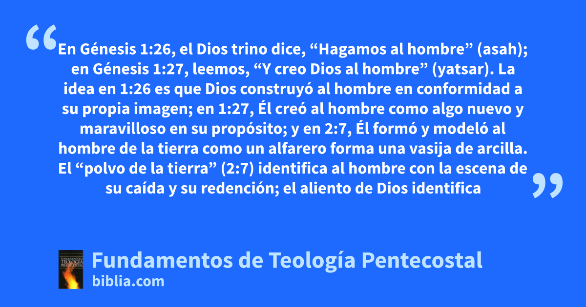 En Génesis 1:26, el Dios trino dice, “Hagamos al hombre” (asah); en Génesis 1:27, leemos, “Y creo Dios al hombre” (yatsar). La idea en 1:26 es que Dios construyó al hombre en conformidad a su propia imagen; en 1:27, Él creó al hombre como algo nuevo y maravilloso en su propósito; y en 2:7, Él formó y modeló al hombre de la tierra como un alfarero forma una vasija de arcilla. El “polvo de la tierra” (2:7) identifica al hombre con la escena de su caída y su redención; el aliento de Dios identifica