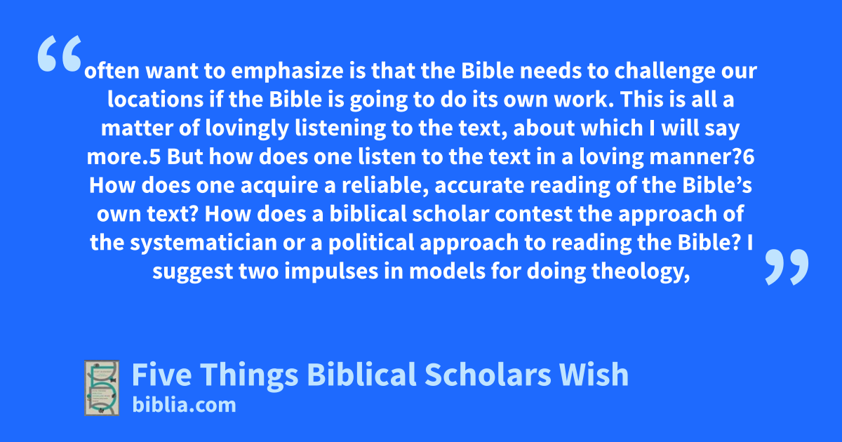 often want to emphasize is that the Bible needs to challenge our locations if the Bible is going to do its own work. This is all a matter of lovingly listening to the text, about which I will say more.5 But how does one listen to the text in a loving manner?6 How does one acquire a reliable, accurate reading of the Bible’s own text? How does a biblical scholar contest the approach of the systematician or a political approach to reading the Bible? I suggest two impulses in models for doing theology,