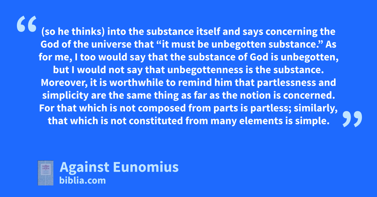 (so he thinks) into the substance itself and says concerning the God of the universe that “it must be unbegotten substance.” As for me, I too would say that the substance of God is unbegotten, but I would not say that unbegottenness is the substance. Moreover, it is worthwhile to remind him that partlessness and simplicity are the same thing as far as the notion is concerned. For that which is not composed from parts is partless; similarly, that which is not constituted from many elements is simple.