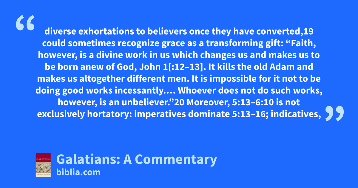 diverse exhortations to believers once they have converted,19 could sometimes recognize grace as a transforming gift: “Faith, however, is a divine work in us which changes us and makes us to be born anew of God, John 1[:12–13]. It kills the old Adam and makes us altogether different men. It is impossible for it not to be doing good works incessantly.… Whoever does not do such works, however, is an unbeliever.”20 Moreover, 5:13–6:10 is not exclusively hortatory: imperatives dominate 5:13–16; indicatives,