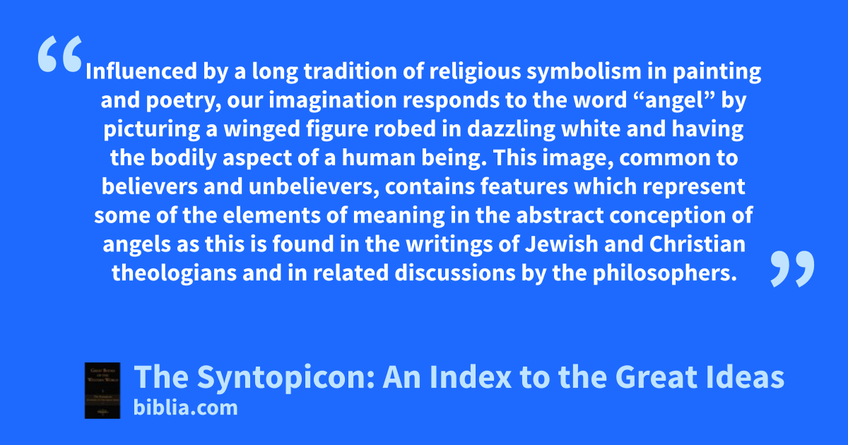 Influenced by a long tradition of religious symbolism in painting and poetry, our imagination responds to the word “angel” by picturing a winged figure robed in dazzling white and having the bodily aspect of a human being. This image, common to believers and unbelievers, contains features which represent some of the elements of meaning in the abstract conception of angels as this is found in the writings of Jewish and Christian theologians and in related discussions by the philosophers.