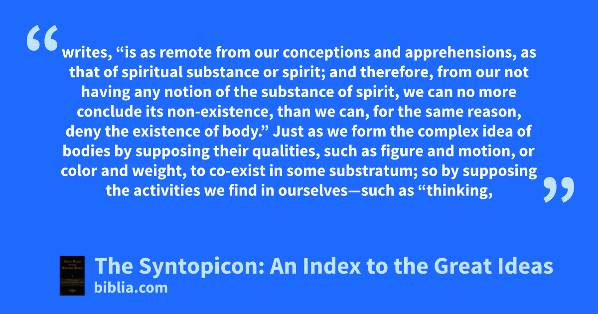 writes, “is as remote from our conceptions and apprehensions, as that of spiritual substance or spirit; and therefore, from our not having any notion of the substance of spirit, we can no more conclude its non-existence, than we can, for the same reason, deny the existence of body.” Just as we form the complex idea of bodies by supposing their qualities, such as figure and motion, or color and weight, to co-exist in some substratum; so by supposing the activities we find in ourselves—such as “thinking,