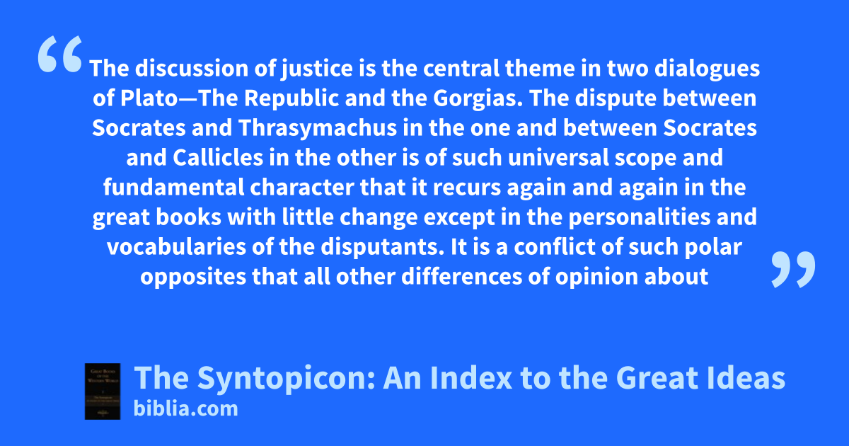 The discussion of justice is the central theme in two dialogues of Plato—The Republic and the Gorgias. The dispute between Socrates and Thrasymachus in the one and between Socrates and Callicles in the other is of such universal scope and fundamental character that it recurs again and again in the great books with little change except in the personalities and vocabularies of the disputants. It is a conflict of such polar opposites that all other differences of opinion about