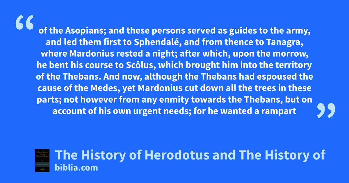 of the Asopians; and these persons served as guides to the army, and led them first to Sphendalé, and from thence to Tanagra, where Mardonius rested a night; after which, upon the morrow, he bent his course to Scôlus, which brought him into the territory of the Thebans. And now, although the Thebans had espoused the cause of the Medes, yet Mardonius cut down all the trees in these parts; not however from any enmity towards the Thebans, but on account of his own urgent needs; for he wanted a rampart