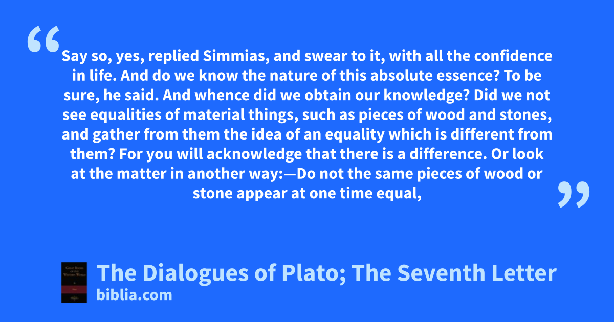 Say so, yes, replied Simmias, and swear to it, with all the confidence in life. And do we know the nature of this absolute essence? To be sure, he said. And whence did we obtain our knowledge? Did we not see equalities of material things, such as pieces of wood and stones, and gather from them the idea of an equality which is different from them? For you will acknowledge that there is a difference. Or look at the matter in another way:—Do not the same pieces of wood or stone appear at one time equal,