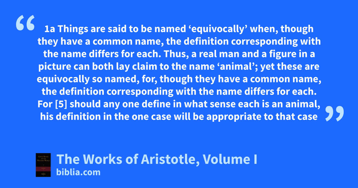 1a Things are said to be named ‘equivocally’ when, though they have a common name, the definition corresponding with the name differs for each. Thus, a real man and a figure in a picture can both lay claim to the name ‘animal’; yet these are equivocally so named, for, though they have a common name, the definition corresponding with the name differs for each. For [5] should any one define in what sense each is an animal, his definition in the one case will be appropriate to that case