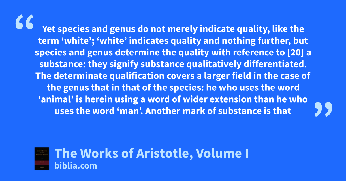 Yet species and genus do not merely indicate quality, like the term ‘white’; ‘white’ indicates quality and nothing further, but species and genus determine the quality with reference to [20] a substance: they signify substance qualitatively differentiated. The determinate qualification covers a larger field in the case of the genus that in that of the species: he who uses the word ‘animal’ is herein using a word of wider extension than he who uses the word ‘man’. Another mark of substance is that