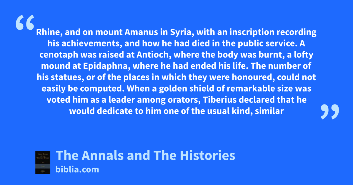 Rhine, and on mount Amanus in Syria, with an inscription recording his achievements, and how he had died in the public service. A cenotaph was raised at Antioch, where the body was burnt, a lofty mound at Epidaphna, where he had ended his life. The number of his statues, or of the places in which they were honoured, could not easily be computed. When a golden shield of remarkable size was voted him as a leader among orators, Tiberius declared that he would dedicate to him one of the usual kind, similar