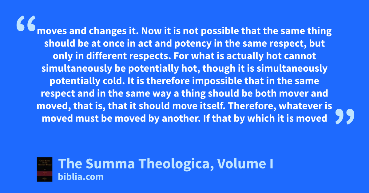 moves and changes it. Now it is not possible that the same thing should be at once in act and potency in the same respect, but only in different respects. For what is actually hot cannot simultaneously be potentially hot, though it is simultaneously potentially cold. It is therefore impossible that in the same respect and in the same way a thing should be both mover and moved, that is, that it should move itself. Therefore, whatever is moved must be moved by another. If that by which it is moved
