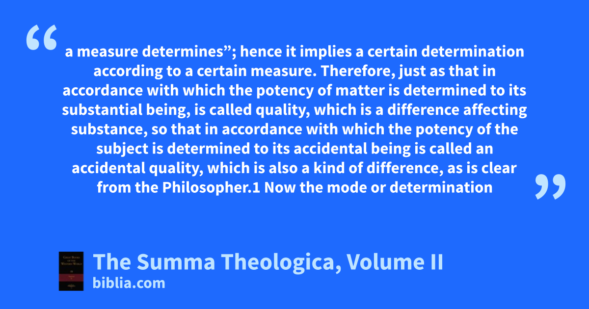 a measure determines”; hence it implies a certain determination according to a certain measure. Therefore, just as that in accordance with which the potency of matter is determined to its substantial being, is called quality, which is a difference affecting substance, so that in accordance with which the potency of the subject is determined to its accidental being is called an accidental quality, which is also a kind of difference, as is clear from the Philosopher.1 Now the mode or determination