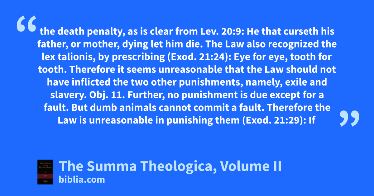 the death penalty, as is clear from Lev. 20:9: He that curseth his father, or mother, dying let him die. The Law also recognized the lex talionis, by prescribing (Exod. 21:24): Eye for eye, tooth for tooth. Therefore it seems unreasonable that the Law should not have inflicted the two other punishments, namely, exile and slavery. Obj. 11. Further, no punishment is due except for a fault. But dumb animals cannot commit a fault. Therefore the Law is unreasonable in punishing them (Exod. 21:29): If