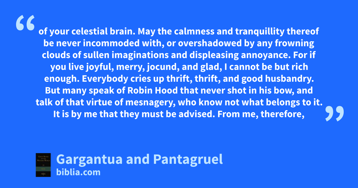 of your celestial brain. May the calmness and tranquillity thereof be never incommoded with, or overshadowed by any frowning clouds of sullen imaginations and displeasing annoyance. For if you live joyful, merry, jocund, and glad, I cannot be but rich enough. Everybody cries up thrift, thrift, and good husbandry. But many speak of Robin Hood that never shot in his bow, and talk of that virtue of mesnagery, who know not what belongs to it. It is by me that they must be advised. From me, therefore,