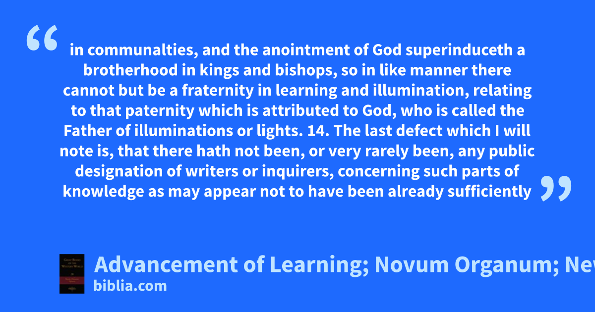 in communalties, and the anointment of God superinduceth a brotherhood in kings and bishops, so in like manner there cannot but be a fraternity in learning and illumination, relating to that paternity which is attributed to God, who is called the Father of illuminations or lights. 14. The last defect which I will note is, that there hath not been, or very rarely been, any public designation of writers or inquirers, concerning such parts of knowledge as may appear not to have been already sufficiently