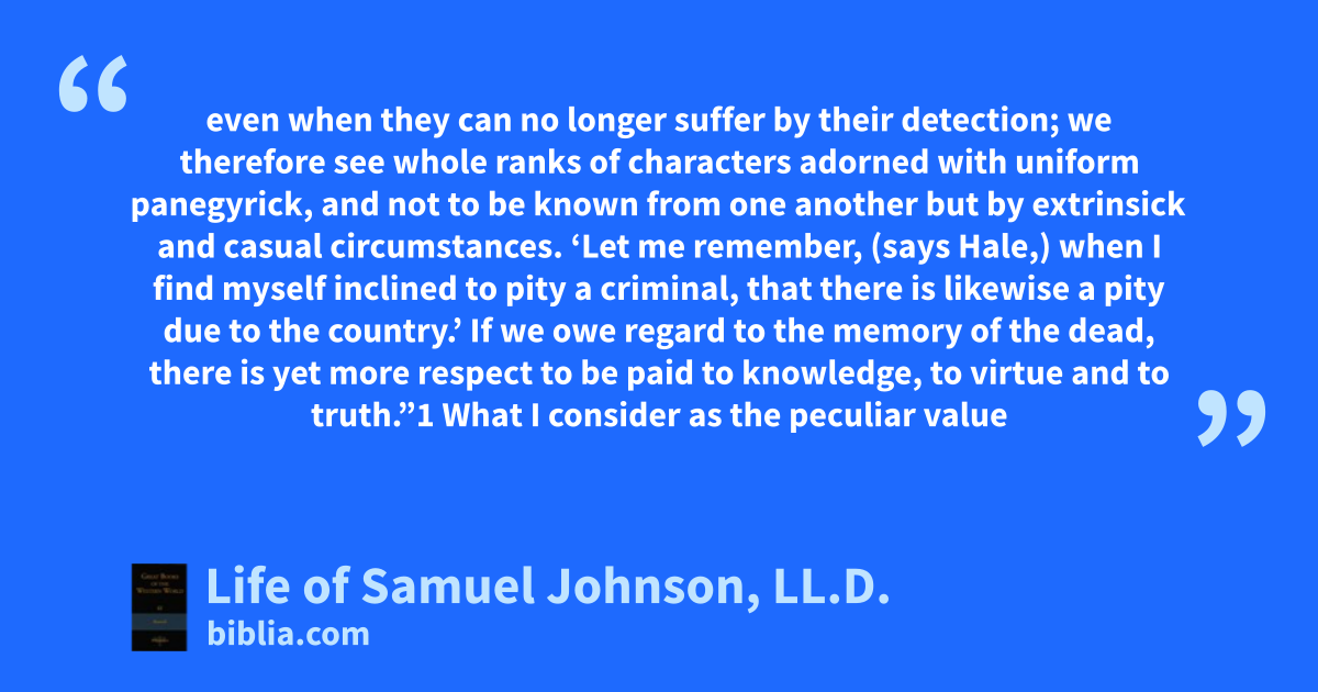 even when they can no longer suffer by their detection; we therefore see whole ranks of characters adorned with uniform panegyrick, and not to be known from one another but by extrinsick and casual circumstances. ‘Let me remember, (says Hale,) when I find myself inclined to pity a criminal, that there is likewise a pity due to the country.’ If we owe regard to the memory of the dead, there is yet more respect to be paid to knowledge, to virtue and to truth.”1 What I consider as the peculiar value